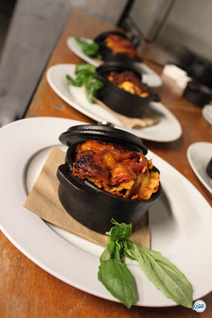 Lasagna served in individual black mini cast iron pots. Grilled Eggplant Lasagna with Ricotta, Wild Mushrooms and Garnet Yams