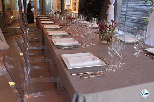 Dinner table set for intimate university alumni event. Menu folded into napkins