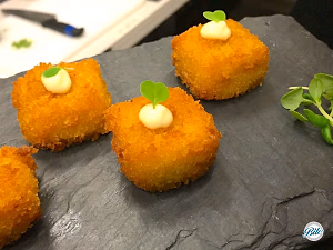 Tray passed mac n cheese bites. Topped with aioli and microgreen