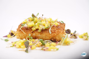 Wild Mahi Mahi with macadamia crust, topped by mango salsa, microgreens, rum beurre noisette