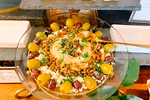 Creamy hummus drizzled with olive oil. With feta, olives, and fresh herbs. Served with pita chips.
