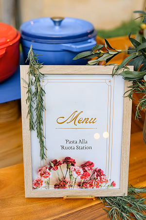Menu for the Pasta Alla Ruota station. Framed in wood. Garnished with Rosemary