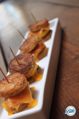 The perfect brunch or breakfast bite with egg, cheddar and crispy bacon on toasted bread served tray passed