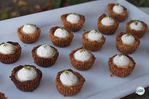 Cashew crusted Key Lime Pies. Arranged on white display tray.