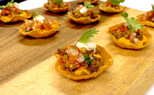 mini loaded nacho bite - seasoned beef with ooey gooey cheese, sour cream, and salsa