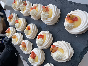 Delicious Mini Pavlova Bites made with crisp meringue, passion fruit curd, cream, and a tropical fruit salsa.
