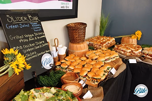 Slider bar station with: Grilled veggie pesto sliders, BBQ chicken sliders, and green salad on a rustic display with sunflowers and custom chalkboard signage