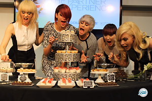 Models ready to eat the dessert assortment: chocolate truffle brownies, mini cheesecake and fruit tarts