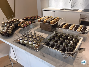 A modern dessert assortment displayed on a marble counter with risers. Chocolate covered strawberries, dessert tarts, mini cupcakes, dessert shots, macaron