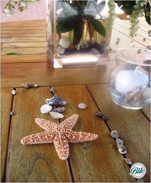 Table with candles, starfish, mussel and other shells