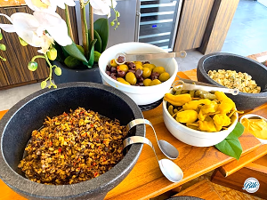 Accompaniments on the grazing table. Tapenade, assorted olives, peppers, pickles, and feta.