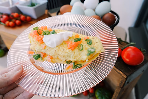 Omelette freshly cooked by a chef at a live action station. Neatly prepared with tomato, onion, sour cream, cheese, and assorted fillings