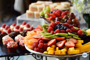 Orchard's harvest closeup with cupcakes and tea sandwiches in the background