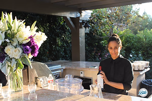 bar set up outdoors with fresh flowers, afternoon sun light and bartender serving drinks.
