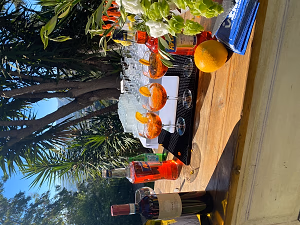 Outdoor cocktail station showing an Aperol and lemon drink