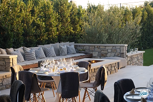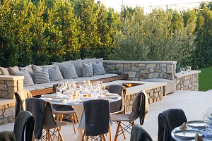 A firepit warms a lounge area outdoors near tables where dinner will be served