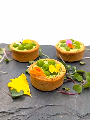 peas, peas, peas herbed goat cheese tart finished with fresh peas and micro greens