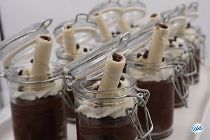 Rich individual pot de creme. Served in glass jars with cream and chocolate pearls and chocolate wafer