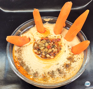 Creamy Hummus Drizzled with Extra Virgin Olive Oil, Feta, Olives and Fresh Herbs - Served with Pita Chips and a carrot hand reaching for HELP!!!