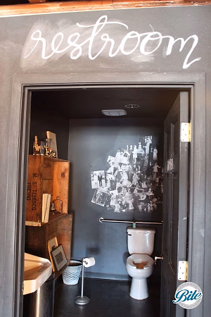 Anything but your boring standard restroom, with colorful chalk areas to customize and fun photographic elements inside