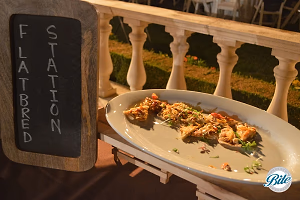 Flatbread Station Wild Mushroom with Bechamel Sauce and Oregano Pine Nut Pesto Flatbread with Fresh Tomatoes Vegan Cheese and sauce option