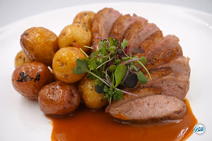 Seared duck breast with a honey lemon glaze and ginger lemongrass jus. Served plated with oven roast potatoes.