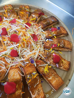 Seared Salmon with ponzu sauce and marinated bean sprouts. Delivered on eco-friendly tray.