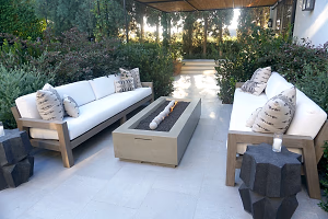 In this backyard, there's a cozy sitting area featuring two large white sofas positioned around a sleek, modern fireplace at the center.