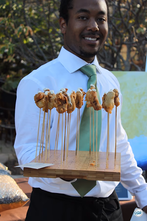 Serving team looking sharp in green ties. Tray passing Vertical Artichoke Beignets with Remoulade