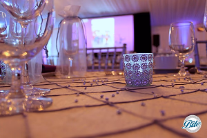 Fundraising dinner with tables, screen, and band