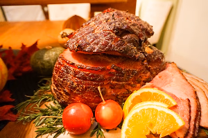 Sliced maple ham with spiced orange maple glaze.