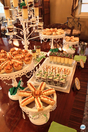 St Patricks day dessert display with Irish coffee pot de creme, chocolate Guinness cake shot, Irish shortbread with caramel and Irish whiskey cream, and caramelized apple tart bites.