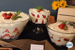Vanilla Cake, whipped cream, vanilla custard and strawberries served on rustic display with fresh flowers, burlap and wood crates