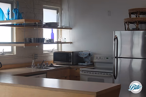 Kitchen at studio 1342 including refridgerator, oven, stovetop.