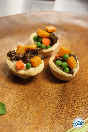 Red wine beef, potatoes, baby peas, carrots and puff pastry tray passed