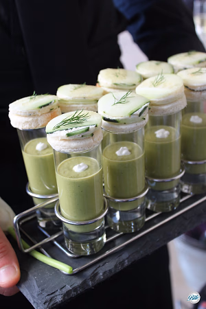 Chilled English Pea Shooters with mini cucumber and boursin tea sandwich canape