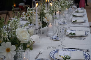 Long tables are set for a plated dinner with luscious florals and hurricane-encased candles
