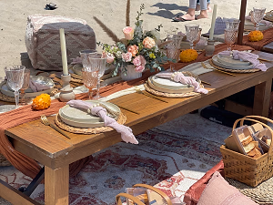 Beautifully table setting for a Birthday Beach Picnic. The table is adorned with a central arrangement of fresh pink flowers, that match the pink napkins placed over each plate. This is a low table over the sand with comfortable pillows for the guests to sit on.
