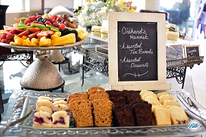 Assorted tea breads with orchard's harvest and tea sandwiches in the background