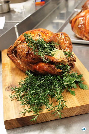 Turkey on carving board ready for your Thanksgiving feast! Filled with herbs: rosemary, lemon