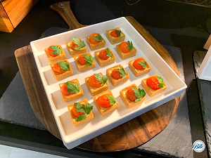 Array of tomato and herb tarts displayed in rows in a white bowl