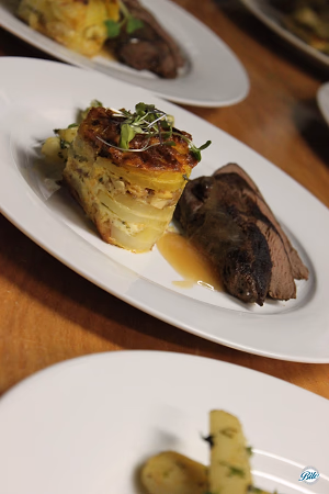 Venison Tenderloin With Poached Pear Gastrique served over yellow beet. Served with Potato Gratin With gruyere And tarragon, with glazed baby parsnips