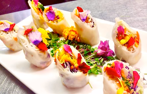 vietnamese summer rolls with peanut sauce - decorated with edible flowers