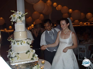 Vijay Goel and Chef Elizabeth cutting the wedding cake