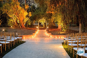 Wedding altar at Newhall Mansion in the backyard. Lit entryway.