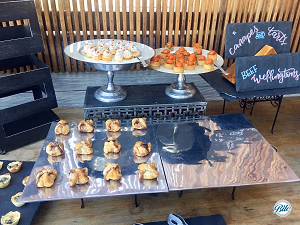 Beef Wellingtons, Puff pastry canapes w/ whipped goat cheese, and slow roasted tomato and herb tart. On risers with chalk signage.